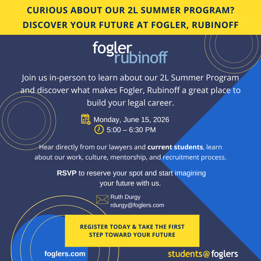Join Myriah Graves, Director of Professional Development, on Monday, June 15, 2026, as we open our doors in-person to 2L law students. Register today and find out what makes Fogler, Rubinoff such a great place to work.