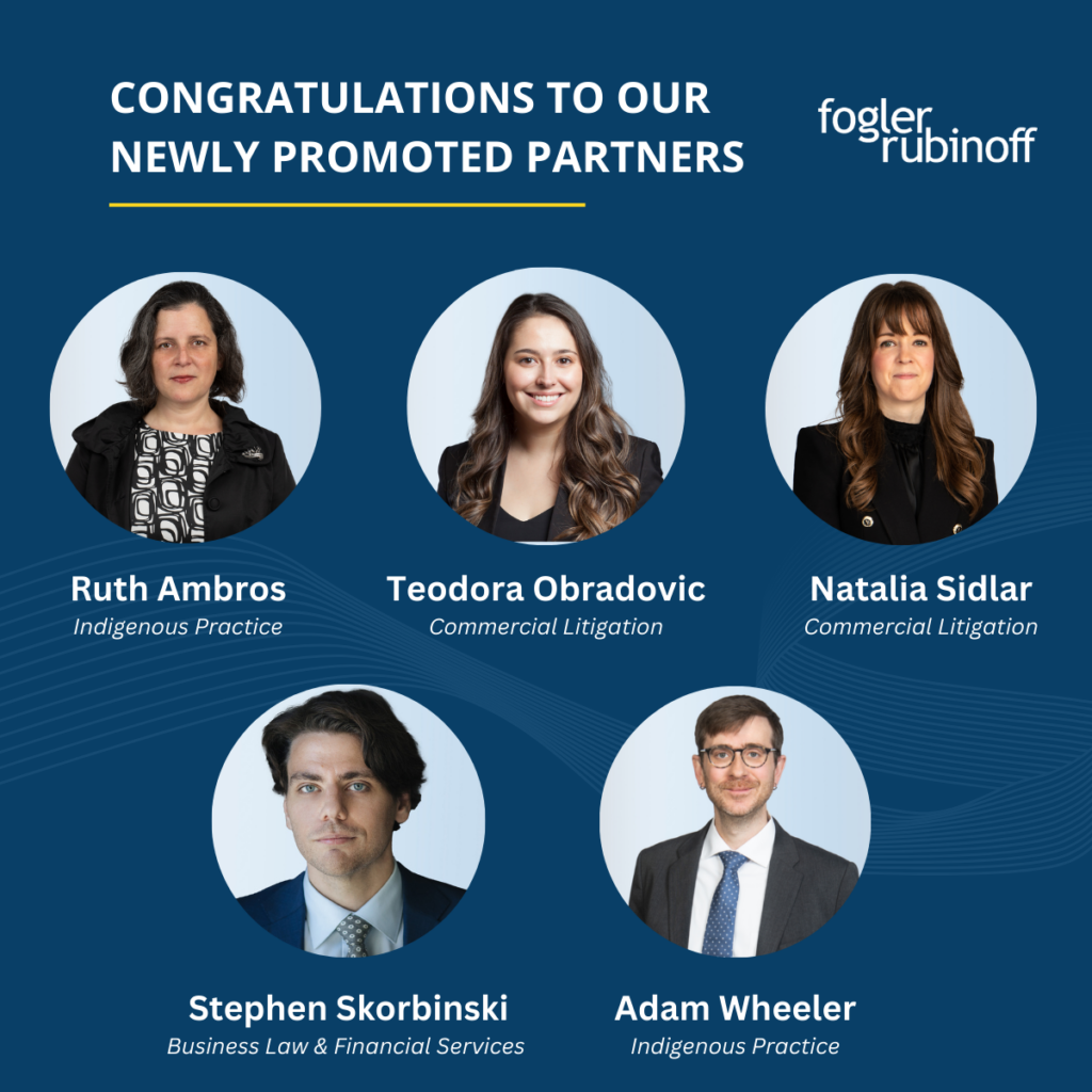 Fogler, Rubinoff LLP is pleased to announce a new milestone in our firm’s leadership. Eric Roblin has been elected as Chair of the firm, and Leneo Sdao as the firm’s new Managing Partner, effective March 1, 2025.
